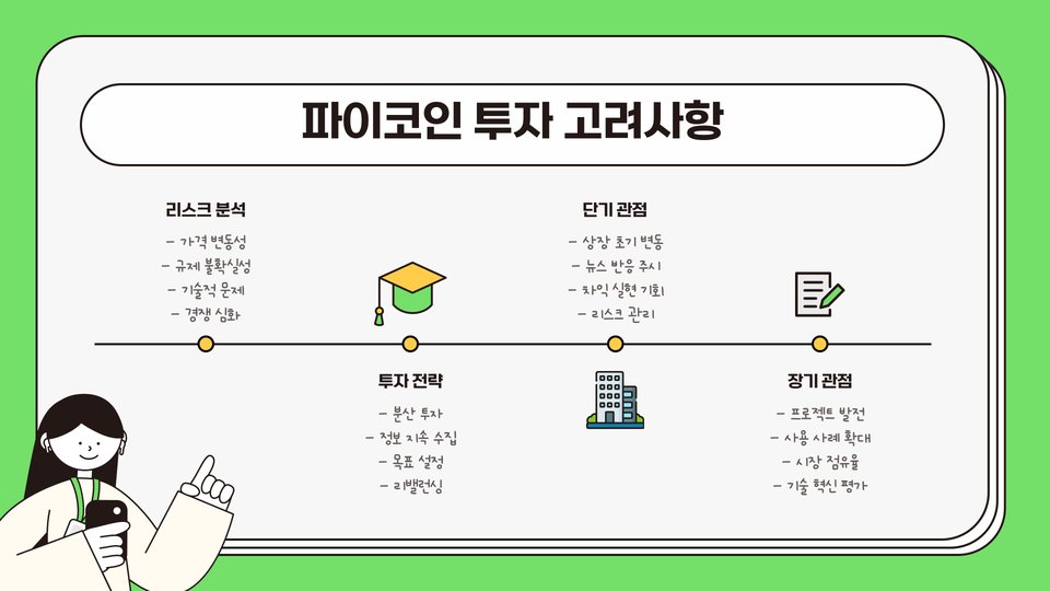 파이코인에 투자하기 전 고려해야 할 몇 가지 요소가 있습니다. 첫째, 시장 조사를 통해 파이코인의 기본적인 특성과 기술을 이해해야 합니다. 둘째, 리스크 관리를 철저히 하고, 투자 금액을 분산시키는 것이 중요합니다. 셋째, 파이코인의 뉴스와 업데이트를 주기적으로 확인하여 변동성에 대비해야 합니다. 상장 초기의 급격한 가격 변동은 리스크를 동반하므로 신중한 접근이 필요합니다.