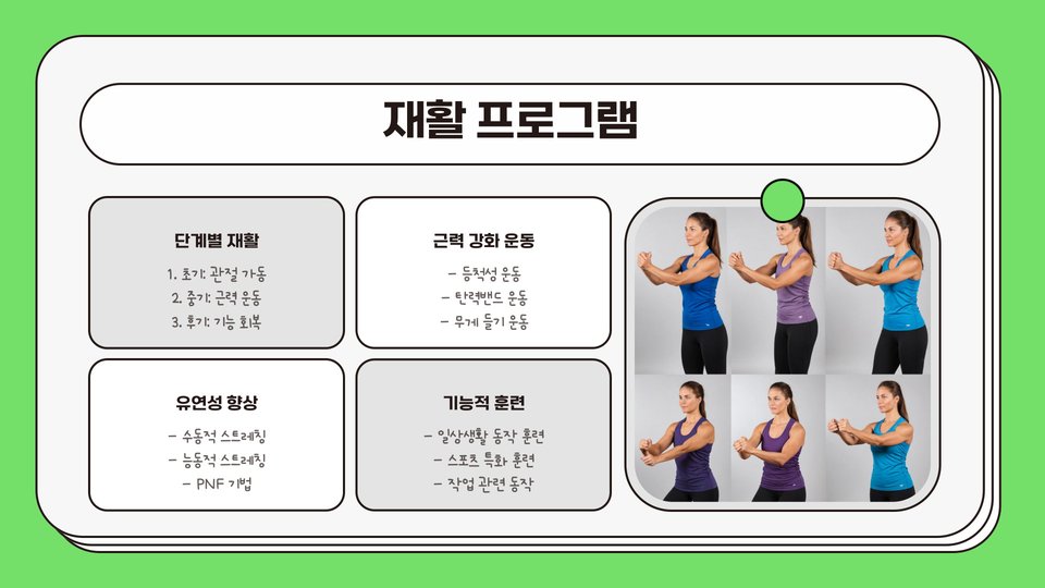 팔 인대 회복 과정에서 물리 치료와 재활 운동은 매우 중요합니다. 전문가의 도움을 받아 적절한 치료를 받는 것이 필요합니다. 물리 치료는 통증 완화, 근육 강화, 관절의 유연성 향상에 도움을 줍니다. 재활 운동은 부상 부위를 안전하게 강화하는 데 중요한 역할을 합니다. 초기에는 가벼운 스트레칭부터 시작하여 점차적으로 강도를 높여가는 것이 바람직합니다.