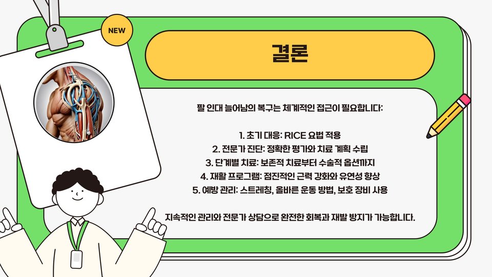 팔 인대의 파열은 일상생활을 방해하지만, 적절한 치료와 관리로 충분히 회복할 수 있습니다. 항상 전문가의 조언을 따르고, 예방 조치를 통해 다시는 같은 부상을 겪지 않도록 주의해야 합니다. 이렇게 함으로써 팔의 건강을 지속적으로 유지할 수 있습니다.