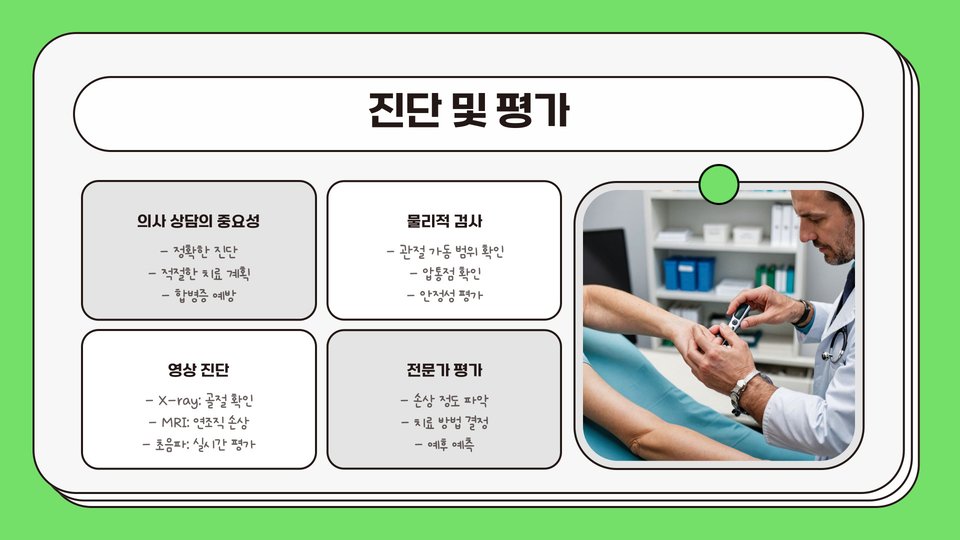 치료 중에는 부상의 재발을 피하기 위해 무리한 활동을 피하고, 필요한 경우 보조기를 착용하는 것이 좋습니다. 통증이 지속되는 경우, 전문의의 진료를 통해 추가적인 치료 방법, 예를 들어 주사 요법이나 수술을 고려해야 할 수 있습니다.