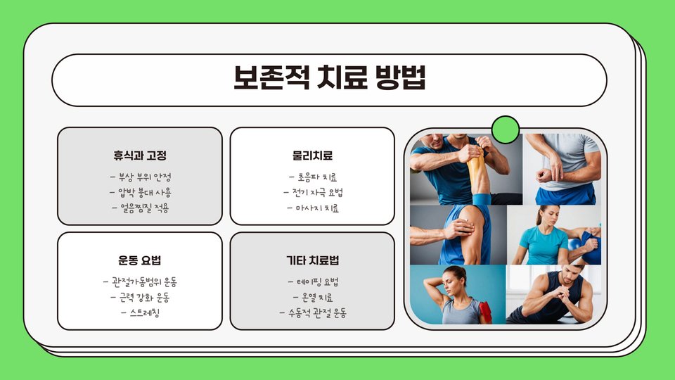 - 물리 치료와 재활 운동이 중요.