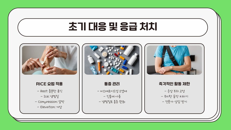 | 자가 치료 | 안정, 얼음 찜질, 압박 및 높임으로 초기 증상 완화 |